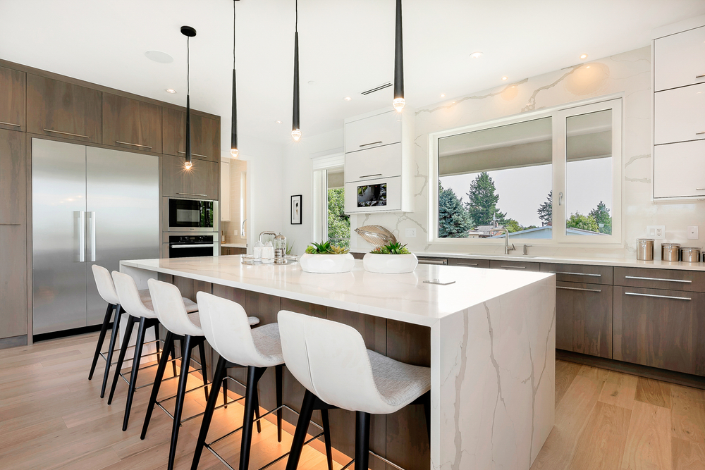 Contrast is important in interior design – but it’s not the end-all be-all for lighting choices. Instead of matching your fixture finishes with t he cabinet hardware or appliances to make them pop, consider looking into pendants that match your countertops or cabinet color! Choosing pieces you love lets your personality shine through the design and it obviously pays off.
