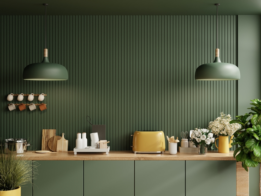 Monochromatic can be a tricky look to pull off, but when it works, it works. Using all green for the cabinets and walls makes the wood and yellow accents pop! The green dome-shaped pendants hung above this bar blend in with the walls to highlight the most-used area in any kitchen – the countertop! The accessories on this counter give the otherwise monotone space plenty of personality with practical pieces in fun pops of color. You could easily whip up some toast and hot chocolate without even opening a drawer!