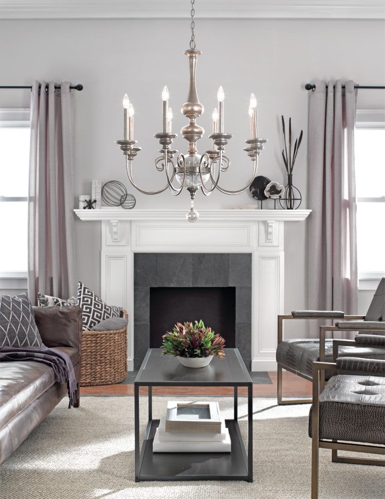 If antlers are really not your thing and you prefer your living room to feel modern and minimalist, look into contemporary light fixtures. The best way to get that contemporary vibe is with fixtures that are sleek and glossy, and composed of simple, clean lines. Geometric chandeliers and angular lamps mesh with a modern, contemporary style perfectly. Stick with neutral colors like black and white, then add some shine with metallic accents.