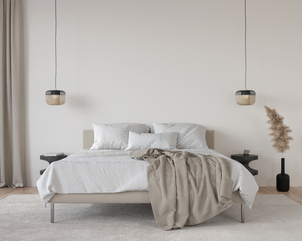This neutral bedroom incorporates beige and white with black accents to ground the space. The night stands with pendants hanging above elevate the space, giving you lighting and a gorgeous focal point! We love how this space feels lived-in without looking cluttery. With neutral tones, the soft textures of the rug and blankets are what make this room feel comfortable and cozy.