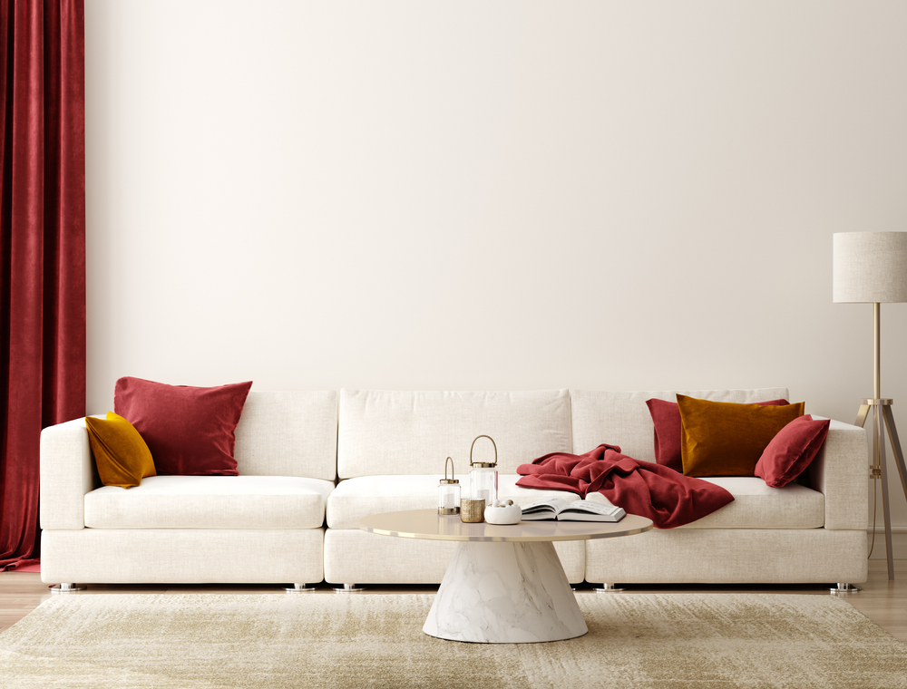 These red velvet pillows and drapes contrast with the neutral room and bring in some cozy texture. The bright colors spice up what might otherwise feel like a bland living room.