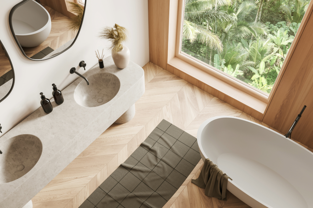 In a home designed in the trends of the 2020s, you’ll notice twists on previous eras of style. Mid-century-inspired mirrors mingle with wood laid in herringbone patterns (a trend from the 16th century!) and hexagon tiles. Modern appliances and light fixtures are nestled in between old-world-inspired wall molding and trim. Today’s bathrooms are designed with style, health, and sustainability in mind – saving the planet while promoting wellness.
