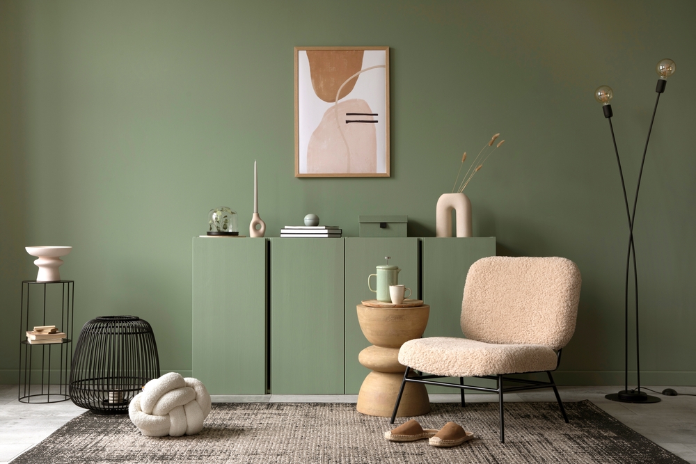 This space seems simple but makes wonderful use of organic, flowing shapes and a subtle punch of color. The sage green wall color and credenza pair well with the soft off-white chair, abstract artwork, and clay vases. Changing up your paint or displaying a few thoughtfully selected decor pieces is an easy way to breathe life into a room.