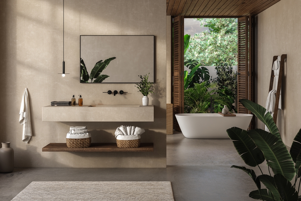 Bathrooms are a great place to start your journey into the organic modern design movement. This bathroom retreat is characterized by a seamless blend of neutral-tones and wood textures. A freestanding bathtub sits beside rustic wood shutters, inviting in the lush plant life outside. A floating vanity keeps the lines in the space clean while leafy potted plants infuse the space with a calming, spa-like ambiance.