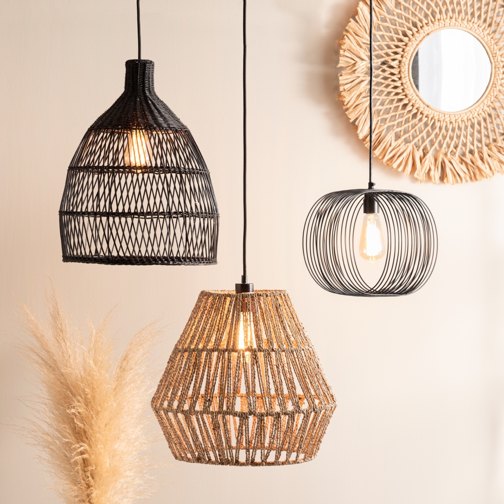 An excellent way to bring an earthy texture and feel into your home is with fixtures and decor pieces made with natural materials – such as these pendant light fixtures made from woven rattan. Other materials to consider include bamboo, wicker, jute, seagrass, limestone, clay, cork, cotton, wool, and leather.